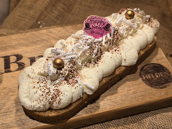 met champagne bavaroise, tropische vruchten compote, meringue en verse slagroom